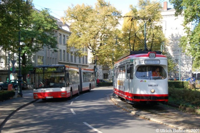Zweimal die Linie 044 - einmal als Bus, einmal als Straßenbahn! Aufgrund von umfangreichen Fahrbahn-Absackungen und -Unterspülungen auf der Hülser Straße wird die Linie 044 noch auf unbestimmte Zeit zwischen der Krefelder Innenstadt und Hüls mit Ersatzbussen bedient. Am 09.10.2009, einen Tag nach Beginn des Ersatzverkehrs, überholt der aus Hüls kommende Ersatzbus der SWK gerade eine wartende Straßenbahn am Friedrichsplatz. Alles weitere zum Ersatzverkehr und noch viele weitere Informationen gibt es im Krefeld-Special!