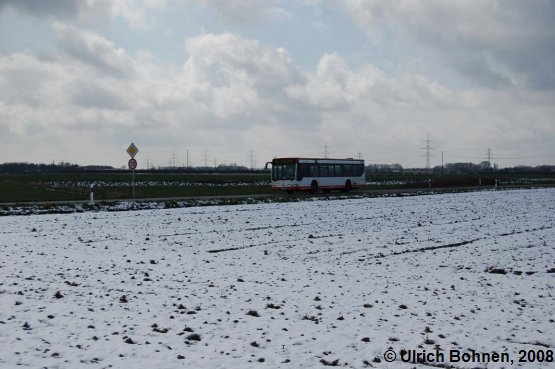 Wenn schon grüne Weihnachten im Winter, dann wenigstens weiße Ostern im Frühjahr! Zu Ostern 2008 hielt noch einmal der Winter Einzug am Niederrhein. Allerdings war durch die teilweise intensiv scheinende Sonne der Schnee recht schnell wieder weg, bevor der nächste Schneeschauer kam. Trotzdem gelang es am Ostermontag, diesen Mercedes Citaro der SWK im Einsatz auf der Linie 054 zwischen Willich-Anrath und Krefeld-Holterhöfe zusammen mit einem schneebedeckten Acker im Bild festzuhalten.