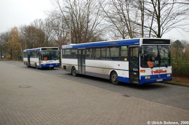 Bereits seit August 2006 ist das Aachener Busunternehmen Taeter im Krefelder Schülerverkehr unterwegs. Am herbstlichen 28.11.2008 mit trübem Himmel konnten zwei Mercedes-Benz O 407 am Badezentrum in Krefeld-Bockum fotografiert werden. Der Bus vorne im Bild mit dem Kennzeichen AC-TA 565 ist regulär nicht in Krefeld unterwegs, da er mit Werbung aus dem Bereich Aachen und mit einem Zahltisch versehen ist. Der AC-TA 131 dahinter jedoch ist seit 2006 Stammfahrzeug in Krefeld.