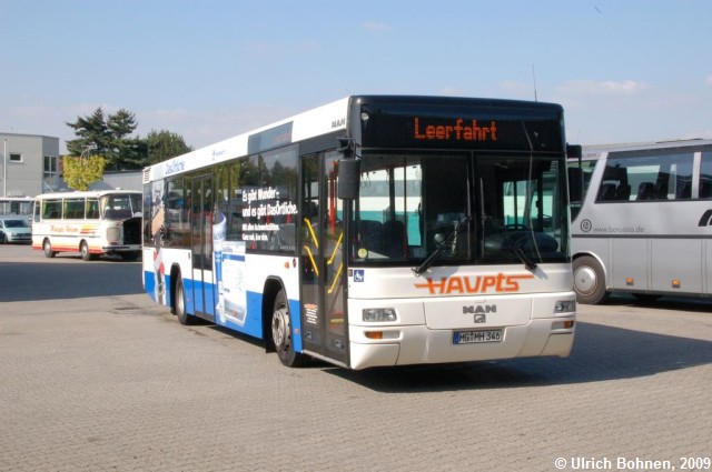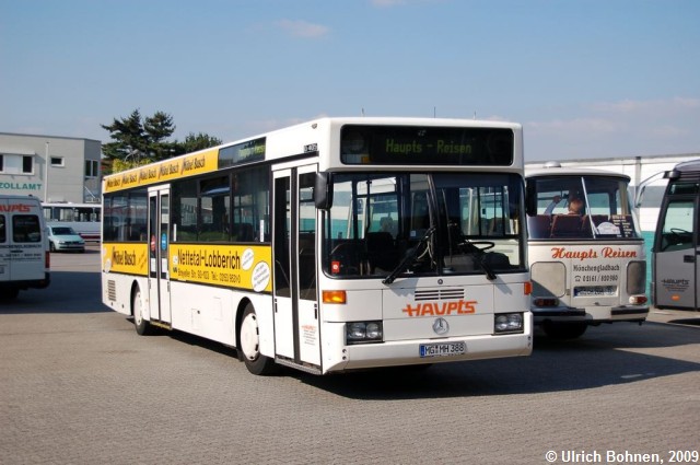 Von Rommerskirchen aus ging es über Grevenbroich und an Korschenbroich vorbei nach Mönchengladbach-Uedding zum Betriebshof der Firma Haupts. Haupts ist im Reiseverkehr, Linienverkehr sowie im Schülerspezialverkehr aktiv. Der typenmäßig gemischte Fuhrpark wurde in Teilen präsentiert; außerdem gab es mit dem 1975 gebauten und vor ein paar Jahren restaurierten Kässbohrer-Setra S 80 eine als Überraschung angesetzte Ausfahrt zum Mönchengladbacher Flughafen.